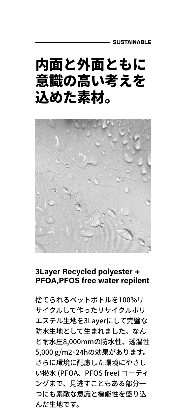 耐水圧8,000mm、透湿性5,000 g/m2・24hの機能性生地